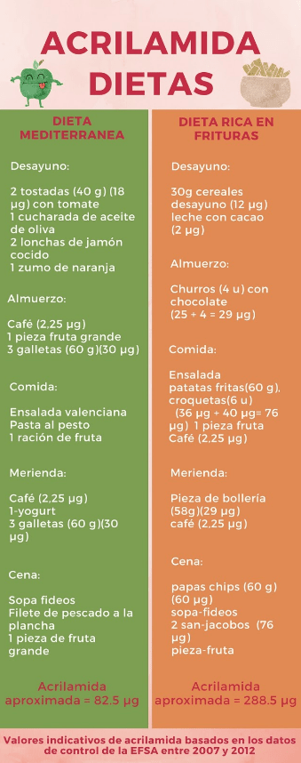 Aquí tenéis dos tipos de menús, uno saludable basado en la dieta mediterránea y otro bastante menos saludable. Reflejan claramente la importancia de llevar una dieta equilibrada y saludable. Los niveles de acrilamida en el menú de fritura aumentan considerablemente. El resultado es aproximadamente un aumento del 250 % .
