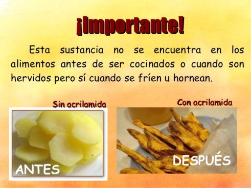 La acrilamida es un compuesto orgánico de bajo peso molecular y muy soluble en agua, que se forma a partir de asparagina y azúcares, componentes que aparecen de forma natural en determinados alimentos cuando se elaboran a temperaturas generalmente superiores a 120 °C y con bajo nivel de humedad. Se forma principalmente en alimentos ricos en hidratos de carbono, horneados o fritos, con materias primas que contienen sus precursores, como cereales, patatas y granos de café. Algunos ejemplos son las patatas fritas, la bollería o los alimentos infantiles elaborados a base de cereales.